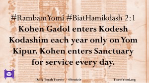 #RambamYomi #BiatHamikdash 2:1 Kohen Gadol enters Kodesh Kodashim each year only on Yom Kipur. Kohen enters Sanctuary for service every day.
