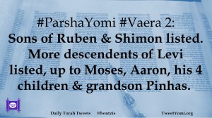 #ParshaYomi #Vaera 2: Sons of Ruben & Shimon listed. More descendents of Levi listed, up to Moses, Aaron, his 4 children & grandson Pinhas.