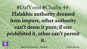 Chulin, DafYomi #DafYomi #Chulin 44 Date: January 10, 2019Author: ysspitz #DafYomi #Chulin 44: Halakhic authority deemed item impure, other authority can’t deem it pure; if one prohibited it, other can’t permit it. Share this: Share on X (Opens in new window) X Share on Facebook (Opens in new window) Facebook Like Loading... Related