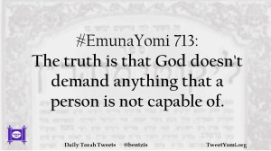 EmunaYomi #EmunaYomi 713 Date: January 11, 2019Author: ysspitz #EmunaYomi 713: The truth is that God doesn’t demand anything that a person is not capable of. Share this: Share on X (Opens in new window) X Share on Facebook (Opens in new window) Facebook Like Loading... Related