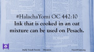 HalachaYomi #HalachaYomi OC 442:10 Date: January 11, 2019Author: ysspitz #HalachaYomi OC 442:10 Ink that is cooked in an oat mixture can be used on Pesach. Share this: Share on X (Opens in new window) X Share on Facebook (Opens in new window) Facebook Like Loading... Related