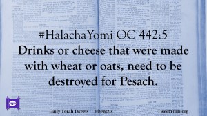 HalachaYomi #HalachaYomi OC 442:5 Date: January 11, 2019Author: ysspitz #HalachaYomi OC 442:5 Drinks or cheese that were made with wheat or oats, need to be destroyed for Pesach. Share this: Share on X (Opens in new window) X Share on Facebook (Opens in new window) Facebook Like Loading... Related