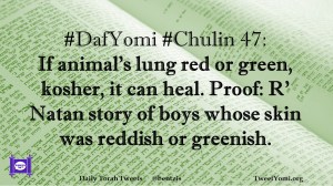 Chulin, DafYomi #DafYomi #Chulin 47 Date: January 13, 2019Author: ysspitz #DafYomi #Chulin 47: If animal’s lung red or green, kosher, it can heal. Proof: R’ Natan story of boys whose skin was reddish or greenish. Share this: Share on X (Opens in new window) X Share on Facebook (Opens in new window) Facebook Like Loading... Related
