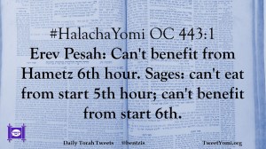 #HalachaYomi OC 443:1 Erev Pesah: Can’t benefit from Hametz 6th hour. Sages: can’t eat from start 5th hour; can’t benefit from start 6th.