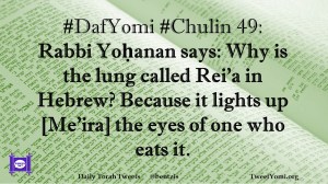 Chulin, DafYomi #DafYomi #Chulin 49 Date: January 15, 2019Author: ysspitz #DafYomi #Chulin 49: Rabbi Yoḥanan says: Why is the lung called Rei’a in Hebrew? Because it lights up [Me’ira] the eyes of one who eats it. Share this: Share on X (Opens in new window) X Share on Facebook (Opens in new window) Facebook Like Loading... Related