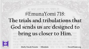 EmunaYomi #EmunaYomi 718 Date: January 16, 2019Author: ysspitz #EmunaYomi 718: The trials and tribulations that God sends us are designed to bring us closer to Him. Share this: Share on X (Opens in new window) X Share on Facebook (Opens in new window) Facebook Like Loading... Related