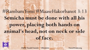 #RambamYomi #MaaseHakorbanot 3:13 Semicha must be done with all his power, placing both hands on animal’s head, not on neck or side of face.