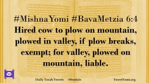 #MishnaYomi #BavaMetzia 6:4 Hired cow to plow on mountain, plowed in valley, if plow breaks, exempt; for valley, plowed on mountain, liable.
