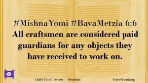BavaMetzia, MishnaYomi #MishnaYomi #BavaMetzia 6:6 Date: January 20, 2019Author: ysspitz #MishnaYomi #BavaMetzia 6:6 All craftsmen are considered paid guardians for any objects they have received to work on. Share this: Share on X (Opens in new window) X Share on Facebook (Opens in new window) Facebook Like Loading... Related