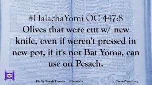#HalachaYomi OC 447:8 Olives that were cut w/ new knife, even if weren’t pressed in new pot, if it’s not Bat Yoma, can use on Pesach.