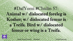 Chulin, DafYomi #DafYomi #Chulin 57 Date: January 23, 2019Author: ysspitz #DafYomi #Chulin 57: Animal w/ dislocated foreleg is Kosher; w/ dislocated femur is a Treifa. Bird w/ dislocated femur or wing is a Treifa. Share this: Share on X (Opens in new window) X Share on Facebook (Opens in new window) Facebook Like Loading... Related