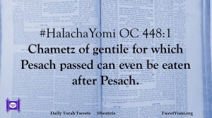 HalachaYomi #HalachaYomi OC 448:1 Date: January 23, 2019Author: ysspitz #HalachaYomi OC 448:1 Chametz of gentile for which Pesach passed can even be eaten after Pesach. Share this: Share on X (Opens in new window) X Share on Facebook (Opens in new window) Facebook Like Loading... Related