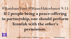 #RambamYomi #MaaseHakorbanot 9:15 If 2 people bring a peace-offering in partnership, one should perform Tenufah with the other’s permission.