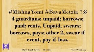 #MishnaYomi #BavaMetzia 7:8 4 guardians: unpaid; borrows; paid; rents. Unpaid, swears; borrows, pays; other 2, swear if event, pay if loss.