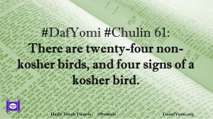 Chulin, DafYomi #DafYomi #Chulin 61 Date: January 28, 2019Author: ysspitz #DafYomi #Chulin 61: There are twenty-four non-kosher birds, and four signs of a kosher bird. Share this: Share on X (Opens in new window) X Share on Facebook (Opens in new window) Facebook Like Loading... Related
