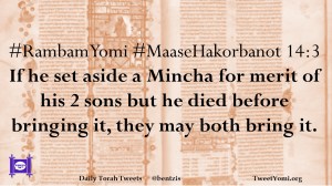 #RambamYomi #MaaseHakorbanot 14:3 If he set aside a Mincha for merit of his 2 sons but he died before bringing it, they may both bring it.
