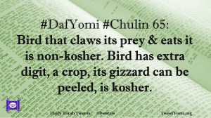 Chulin, DafYomi #DafYomi #Chulin 65 Date: January 31, 2019Author: ysspitz #DafYomi #Chulin 65: Bird that claws its prey & eats it is non-kosher. Bird has extra digit, a crop, its gizzard can be peeled, is kosher. Share this: Share on X (Opens in new window) X Share on Facebook (Opens in new window) Facebook Like Loading... Related