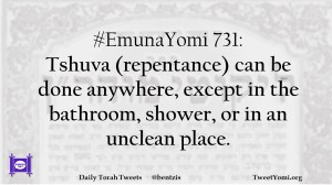 EmunaYomi #EmunaYomi 731 Date: January 31, 2019Author: ysspitz #EmunaYomi 731: Tshuva (repentance) can be done anywhere, except in the bathroom, shower, or in an unclean place. Share this: Share on X (Opens in new window) X Share on Facebook (Opens in new window) Facebook Like Loading... Related