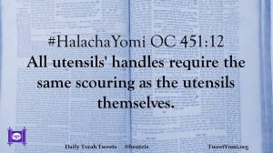 HalachaYomi #HalachaYomi OC 451:12 Date: February 1, 2019Author: ysspitz #HalachaYomi OC 451:12 All utensils’ handles require the same scouring as the utensils themselves. Share this: Share on X (Opens in new window) X Share on Facebook (Opens in new window) Facebook Like Loading... Related