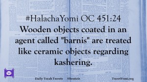 #HalachaYomi OC 451:24 Wooden objects coated in an agent called “barnis” are treated like ceramic objects regarding kashering.