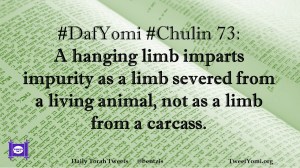 Chulin, DafYomi #DafYomi #Chulin 73 Date: February 8, 2019Author: ysspitz #DafYomi #Chulin 73: A hanging limb imparts impurity as a limb severed from a living animal, not as a limb from a carcass. Share this: Share on X (Opens in new window) X Share on Facebook (Opens in new window) Facebook Like Loading... Related