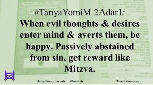 #TanyaYomiM 2Adar1: When evil thoughts & desires enter mind & averts them, be happy. Passively abstained from sin, get reward like Mitzva.