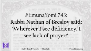 EmunaYomi #EmunaYomi 743 Date: February 10, 2019Author: ysspitz #EmunaYomi 743: Rabbi Nathan of Breslov said: “Wherever I see deficiency, I see lack of prayer!” Share this: Share on X (Opens in new window) X Share on Facebook (Opens in new window) Facebook Like Loading... Related