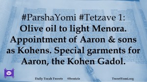 #ParshaYomi #Tetzave 1: Olive oil to light Menora. Appointment of Aaron & sons as Kohens. Special garments for Aaron, the Kohen Gadol.