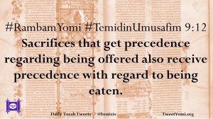 #RambamYomi #TemidinUmusafim 9:12 Sacrifices that get precedence regarding being offered also receive precedence with regard to being eaten.