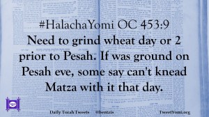 #HalachaYomi OC 453:9 Need to grind wheat day or 2 prior to Pesah. If was ground on Pesah eve, some say can’t knead Matza with it that day.