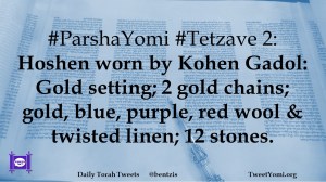 #ParshaYomi #Tetzave 2: Hoshen worn by Kohen Gadol: Gold setting; 2 gold chains; gold, blue, purple, red wool & twisted linen; 12 stones.