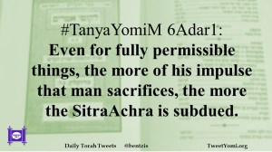 #TanyaYomiM 6Adar1: Even for fully permissible things, the more of his impulse that man sacrifices, the more the SitraAchra is subdued.