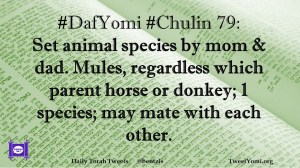 Chulin, DafYomi #DafYomi #Chulin 79 Date: February 14, 2019Author: ysspitz #DafYomi #Chulin 79: Set animal species by mom & dad. Mules, regardless which parent horse or donkey; 1 species; may mate with each other. Share this: Share on X (Opens in new window) X Share on Facebook (Opens in new window) Facebook Like Loading... Related