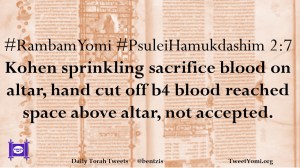 #RambamYomi #PsuleiHamukdashim 2:7 Kohen sprinkling sacrifice blood on altar, hand cut off b4 blood reached space above altar, not accepted.