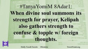 #TanyaYomiM 8Adar1: When divine soul summons its strength for prayer, Kelipah also gathers strength to confuse & topple w/ foreign thoughts.