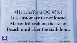 HalachaYomi #HalachaYomi OC 458:1 Date: February 17, 2019Author: ysspitz #HalachaYomi OC 458:1 It is customary to not knead Matzot Mitzvah on the eve of Pesach until after the sixth hour. Share this: Share on X (Opens in new window) X Share on Facebook (Opens in new window) Facebook Like Loading... Related