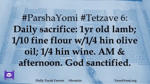 #ParshaYomi #Tetzave 6: Daily sacrifice: 1yr old lamb; 1/10 fine flour w/1/4 hin olive oil; 1/4 hin wine. AM & afternoon. God sanctified.