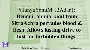 #TanyaYomiM 12Adar1: Benoni, animal soul from SitraAchra pervades blood & flesh. Allows lusting drive to lust for forbidden things.