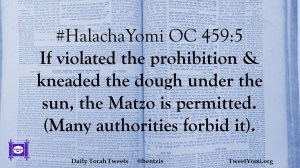 #HalachaYomi OC 459:5 If violated the prohibition & kneaded the dough under the sun, the Matzo is permitted. (Many authorities forbid it).