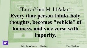 TanyaYomiM #TanyaYomiM 14Adar1 Date: February 19, 2019Author: ysspitz #TanyaYomiM 14Adar1: Every time person thinks holy thoughts, becomes “vehicle” of holiness, and vice versa with impurity. Share this: Share on X (Opens in new window) X Share on Facebook (Opens in new window) Facebook Like Loading... Related