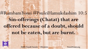 #RambamYomi #PsuleiHamukdashim 10:5 Sin-offerings (Chatat) that are offered because of a doubt, should not be eaten, but are burnt.
