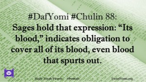 Chulin, DafYomi #DafYomi #Chulin 88 Date: February 22, 2019Author: ysspitz #DafYomi #Chulin 88: Sages hold that expression: “Its blood,” indicates obligation to cover all of its blood, even blood that spurts out. Share this: Share on X (Opens in new window) X Share on Facebook (Opens in new window) Facebook Like Loading... Related