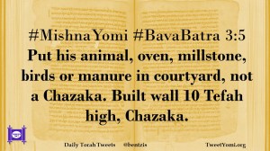 #MishnaYomi #BavaBatra 3:5 Put his animal, oven, millstone, birds or manure in courtyard, not a Chazaka. Built wall 10 Tefah high, Chazaka.