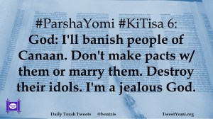 #ParshaYomi #KiTisa 6: God: I’ll banish people of Canaan. Don’t make pacts w/ them or marry them. Destroy their idols. I’m a jealous God.