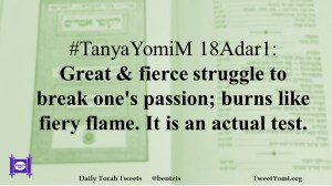 TanyaYomiM #TanyaYomiM 18Adar1 Date: February 22, 2019Author: ysspitz #TanyaYomiM 18Adar1: Great & fierce struggle to break one’s passion; burns like fiery flame. It is an actual test. Share this: Share on X (Opens in new window) X Share on Facebook (Opens in new window) Facebook Like Loading... Related