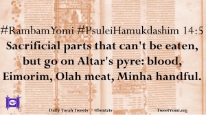 #RambamYomi #PsuleiHamukdashim 14:5 Sacrificial parts that can’t be eaten, but go on Altar’s pyre: blood, Eimorim, Olah meat, Minha handful.