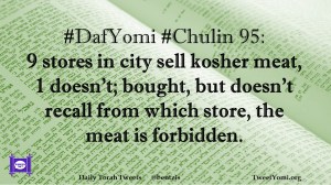 Chulin, DafYomi #DafYomi #Chulin 95 Date: March 1, 2019Author: ysspitz #DafYomi #Chulin 95: 9 stores in city sell kosher meat, 1 doesn’t; bought, but doesn’t recall from which store, the meat is forbidden. Share this: Share on X (Opens in new window) X Share on Facebook (Opens in new window) Facebook Like Loading... Related