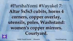 #ParshaYomi #Vayakel 7: Altar 5x5x3 cubits, horns 4 corners, copper overlay, utensils, poles. Washstand: women’s copper mirrors. Courtyard.