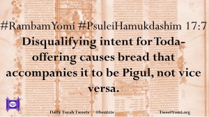 #RambamYomi #PsuleiHamukdashim 17:7 Disqualifying intent for Toda-offering causes bread that accompanies it to be Pigul, not vice versa.