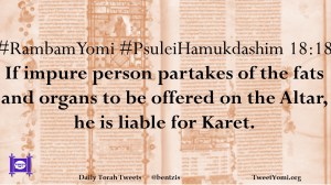 #RambamYomi #PsuleiHamukdashim 18:18 If impure person partakes of the fats and organs to be offered on the Altar, he is liable for Karet.